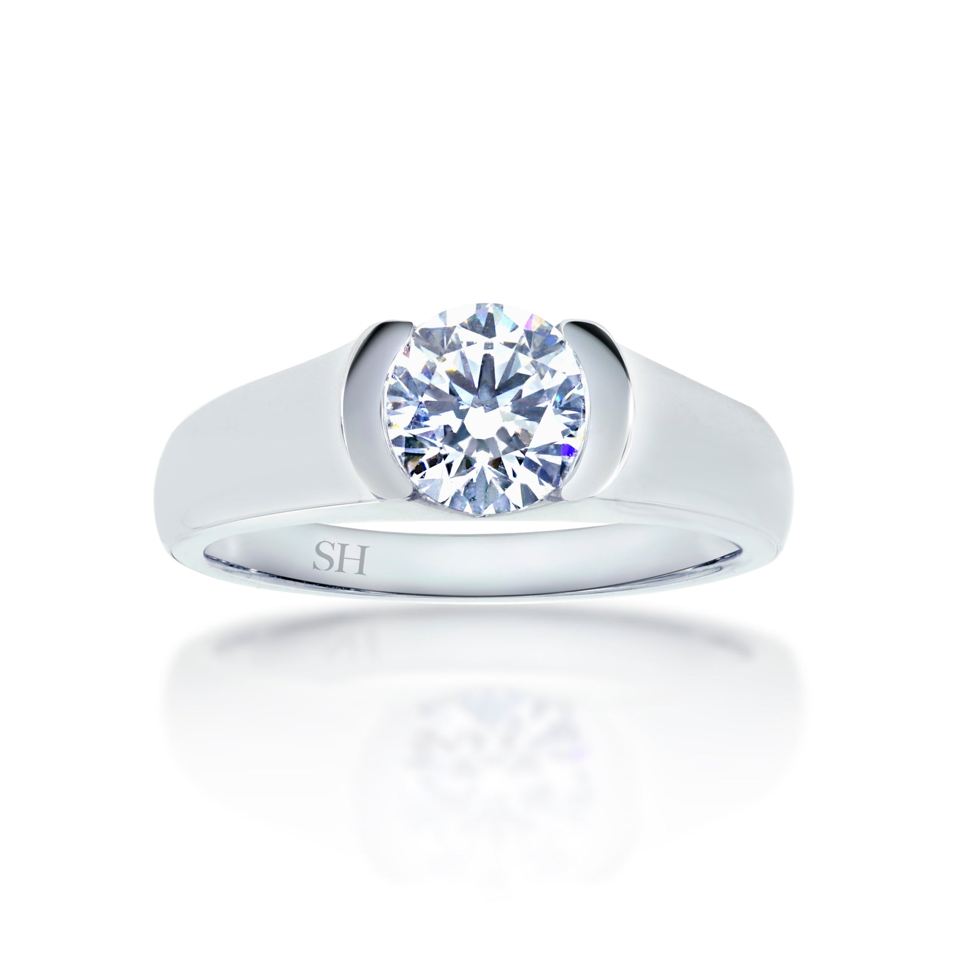 At SH Jewellery, our modern half-bezel set solitaire engagement ring offers a similar level of protection, while allowing maximum light to flood the diamond. Flared half-moon panels on both sides further emphasise the size of the stone, and a high-polished finish effortlessly reflects light in harmony with the diamond.
