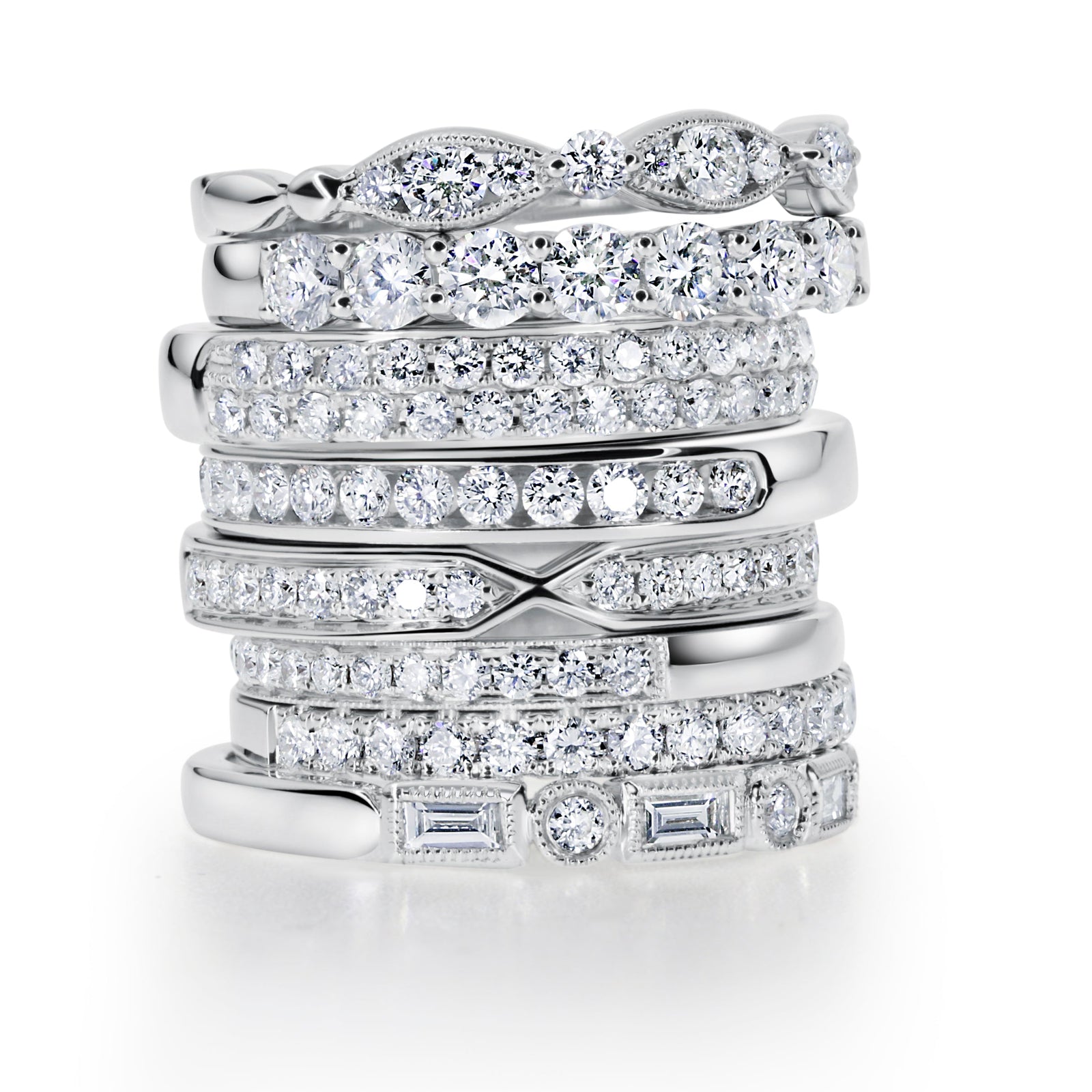 Women’s diamond wedding bands are traditionally worn in front of the engagement ring on the left hand (fourth finger from the right). They are best paired with diamond engagement rings of the same metal colour, width and diamond setting type. Women’s fancy diamond wedding bands can also make a beautifully contrasted companion for a plain-band solitaire engagement ring.