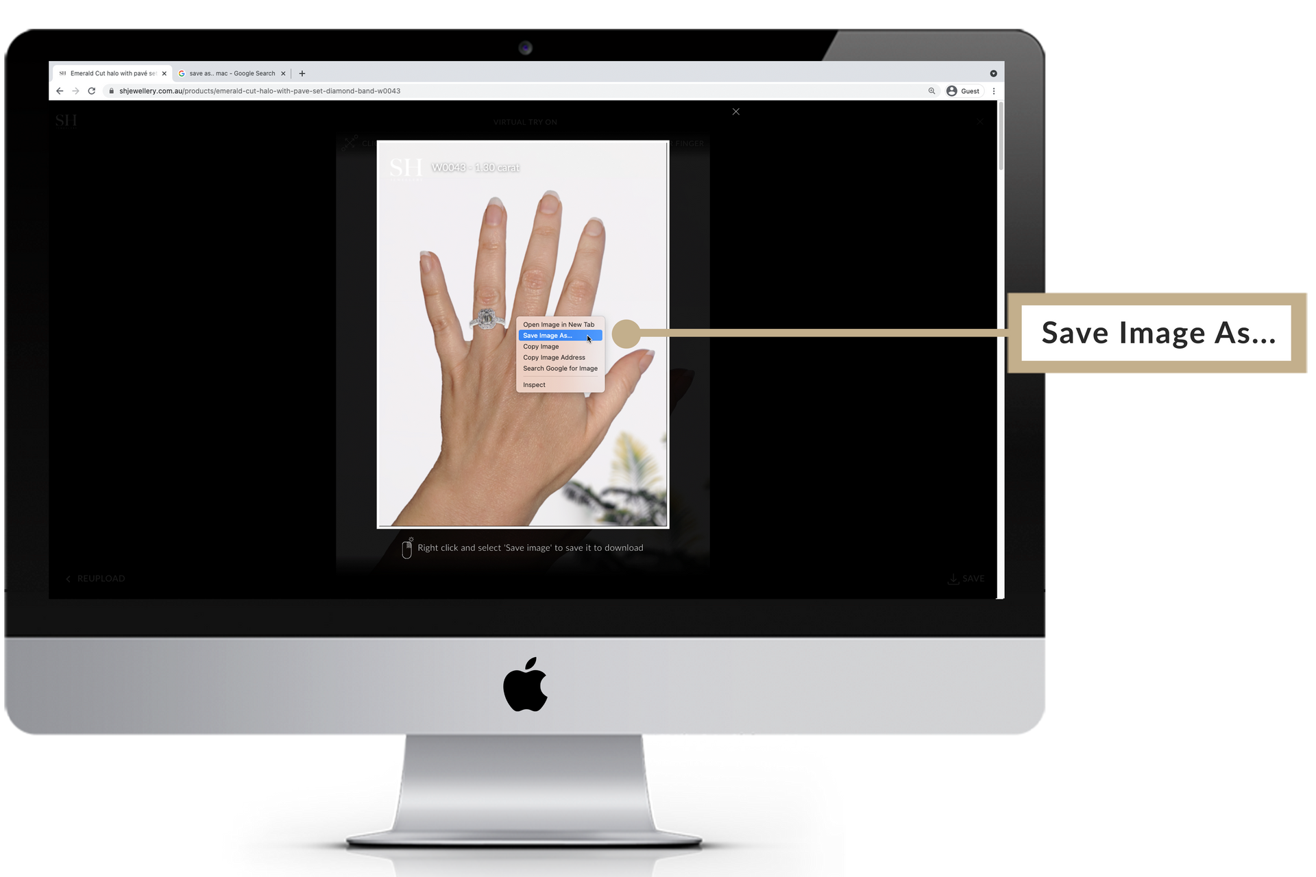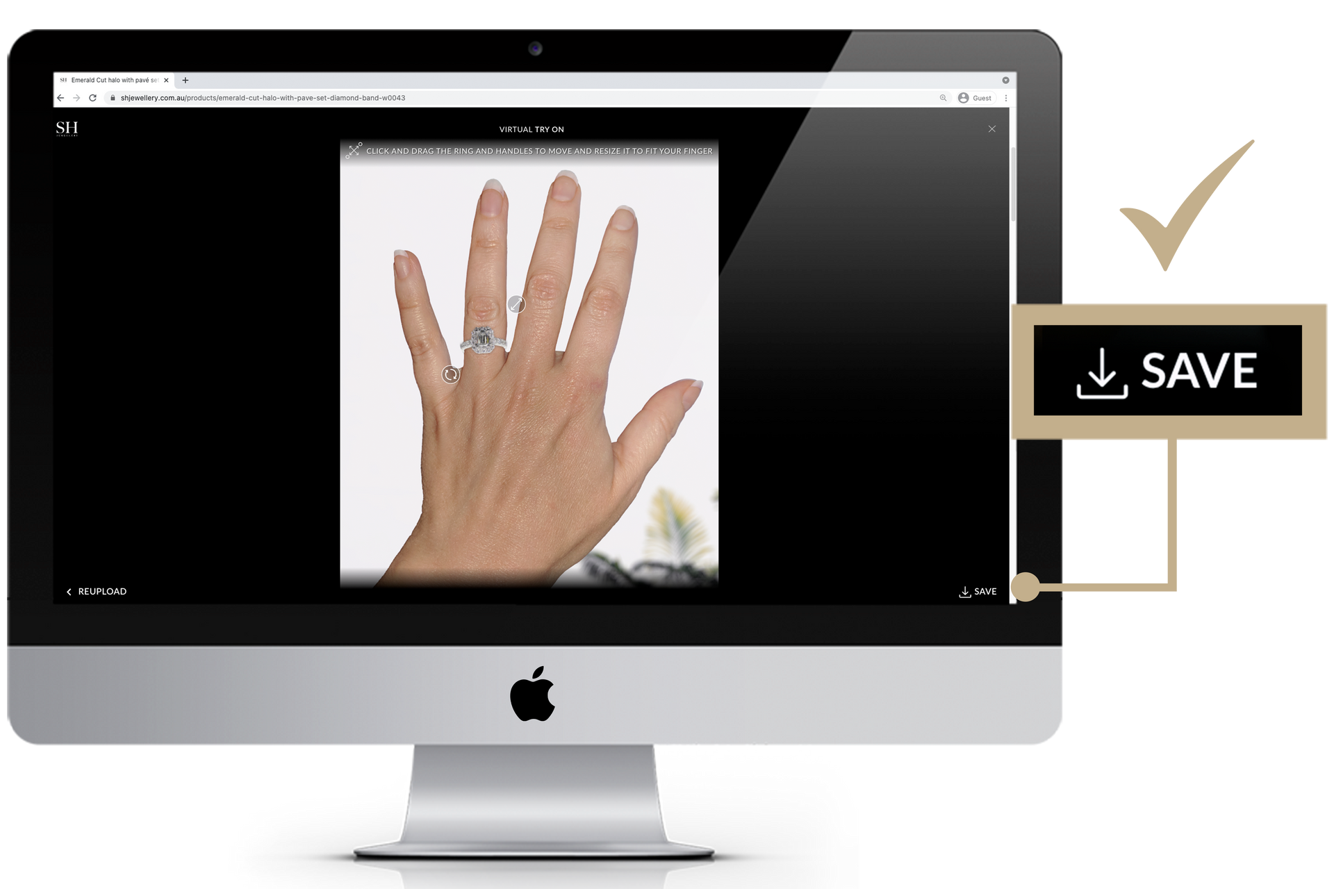 Once uploaded, use your mouse to drag the ring onto your finger. Use the zoom and rotate tools to adjust the size and angle of the ring until it fits your finger perfectly.