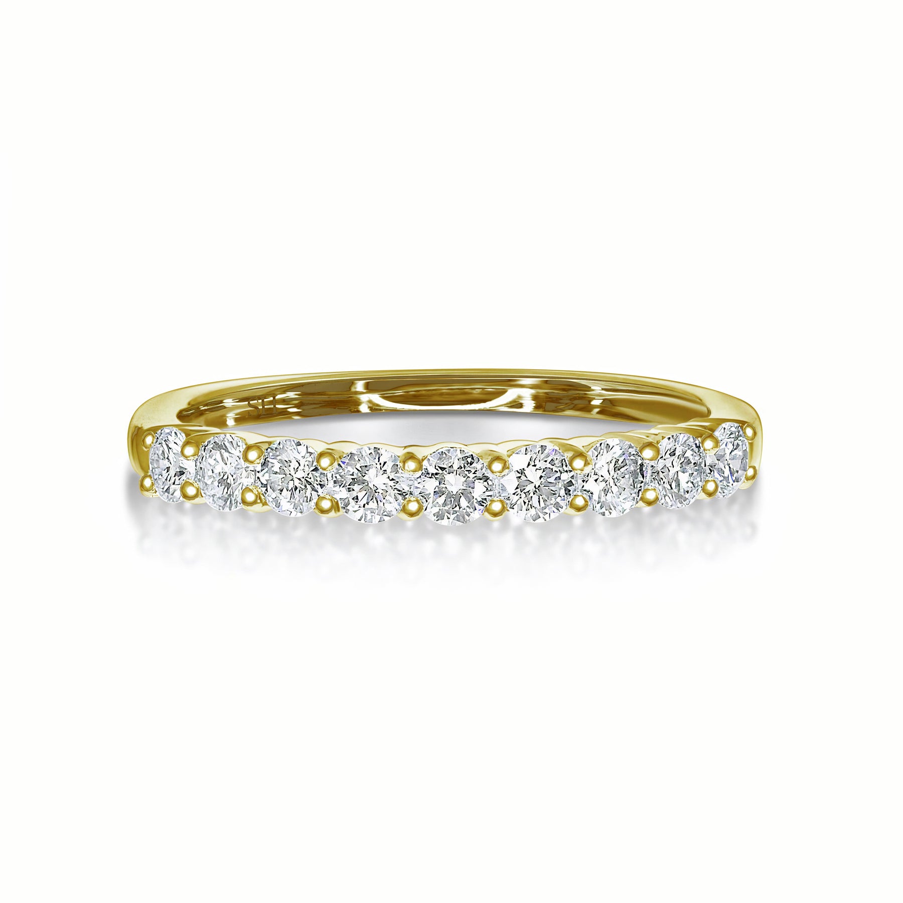 An 18kt gold double shared prong set women's diamond wedding band featuring a sparkling arch of round brilliant cut diamonds. This distinctive setting style allows the body of the diamond to be viewed from the side and for light to enter easily. The ring is designed to sit flush alongside an engagement ring or to be worn alone in it's own beauty.