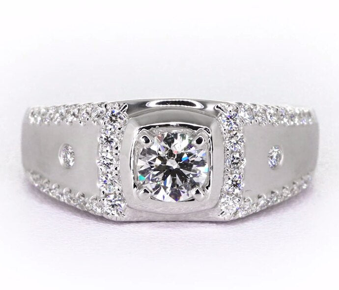 A medium width diamond ring utilising a border of pave set diamonds and matte finish texture, creating a gleaming and modern band. The band tapers up towards the centre panel allowing for the centre diamond to float fluidly above the ring.
