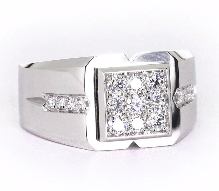 A geometric mens band utilising white diamonds to create a bright and captivating centre. A generous smooth band combines a brushed finish and single row of diamonds for detail and contrast.