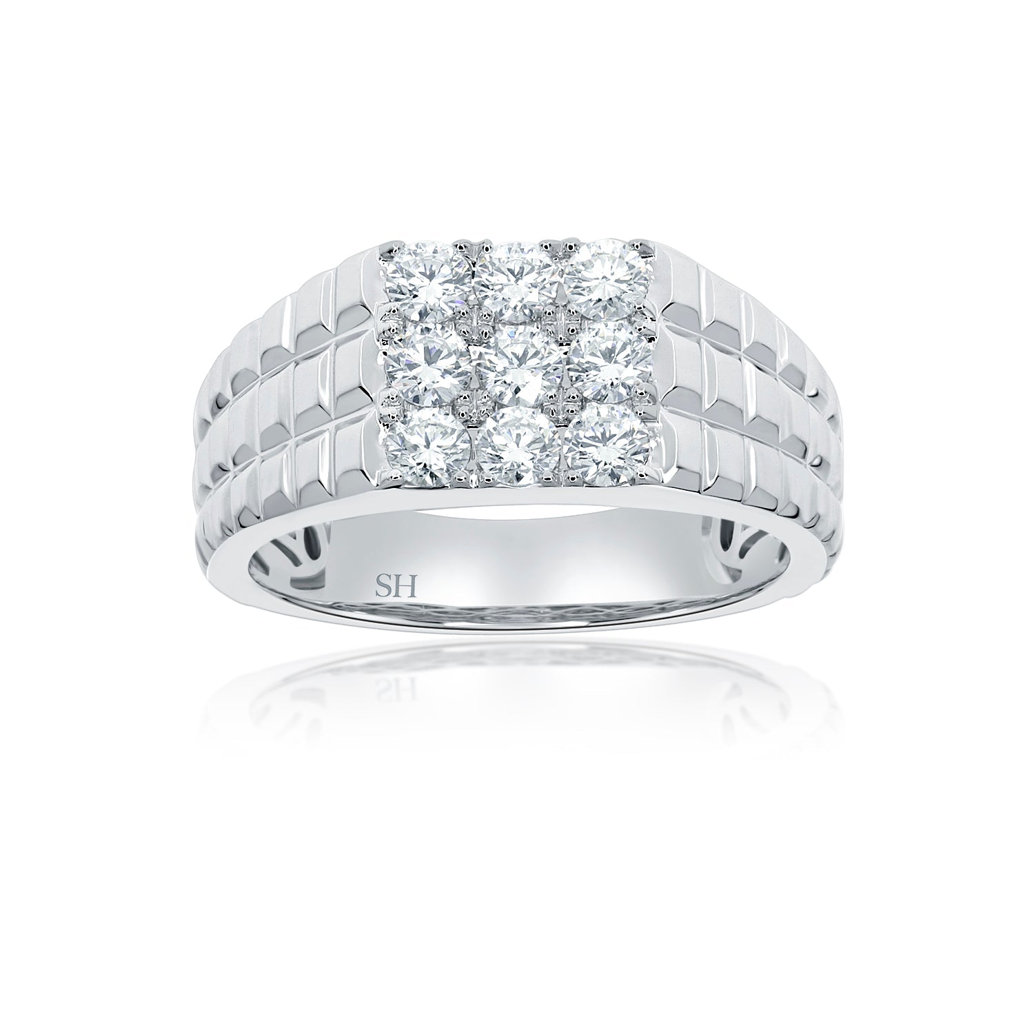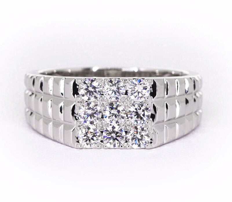 3x3 grid of round diamonds set into a top square panel and complimented with a tapering polished band. Unique band is formed from a lattic of geometric panels.