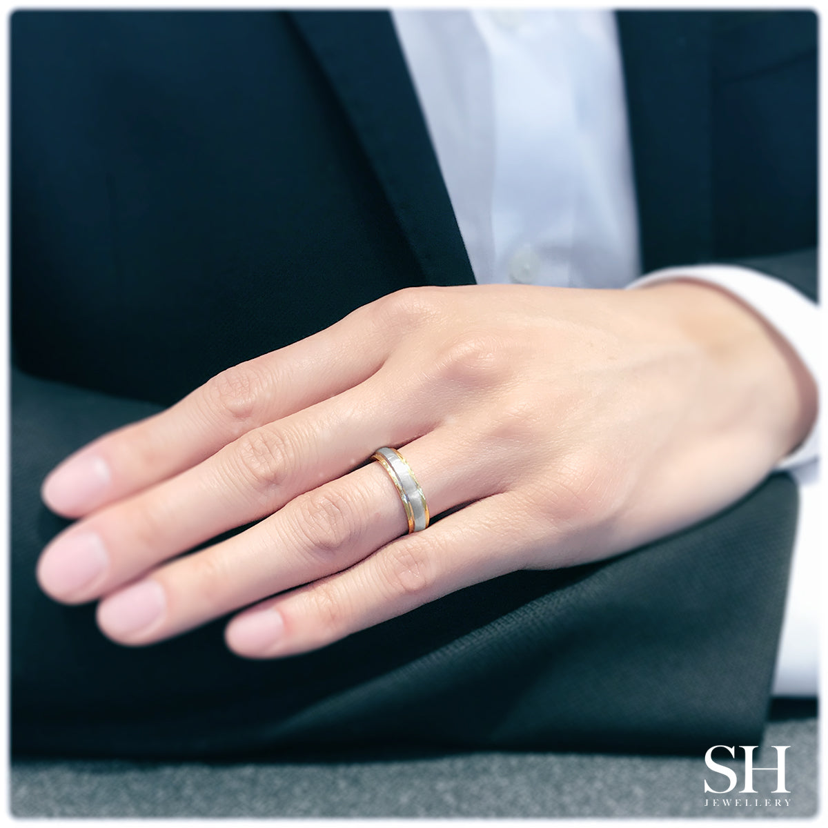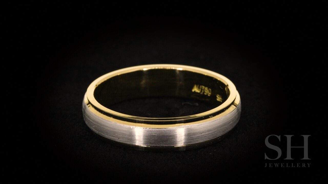 This stylish medium width 18kt yellow and white gold men's wedding band features a white gold half centre with satin finish applied. Polished yellow gold edges create a contrast with the satin finish applied to the centre of the ring. A timeless and elegant look.