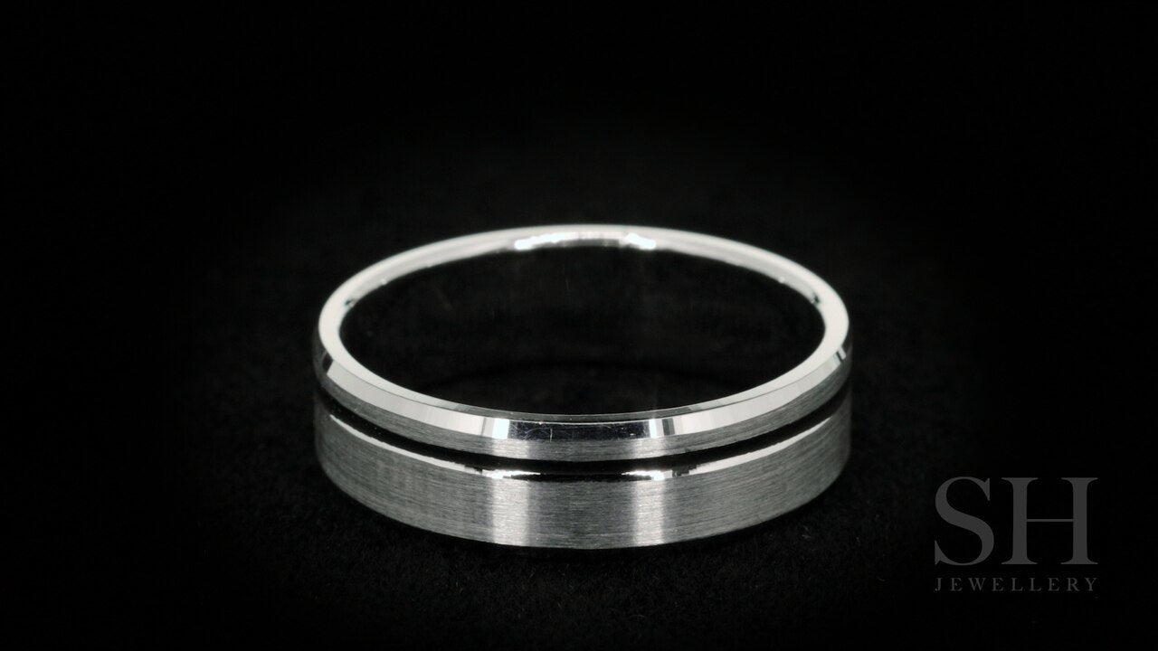 Men's white gold satin finish wedding band with bevelled edges and offset groove (6mm) - W0137
