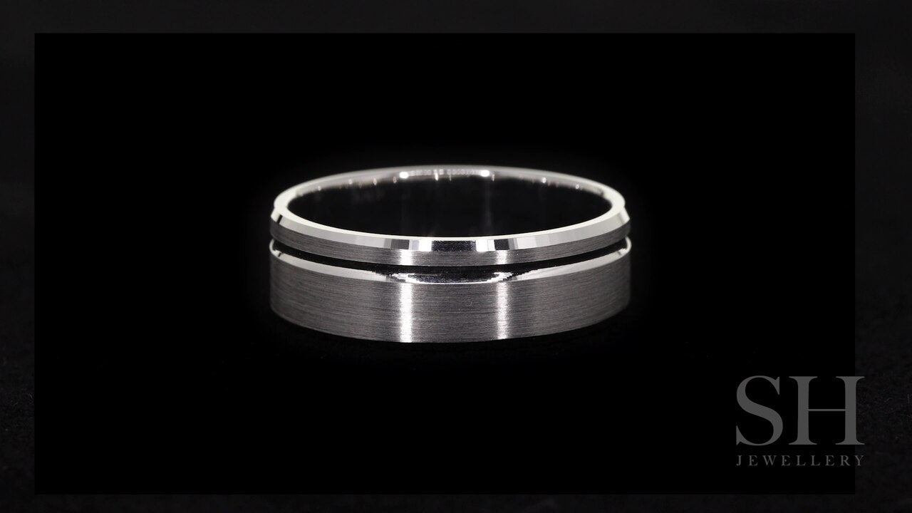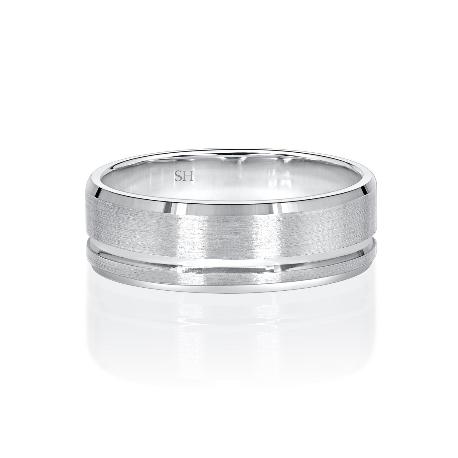 Men's White Gold Satin Finish Wedding Band With Bevelled Edges & Offset Groove (7mm) - W0501