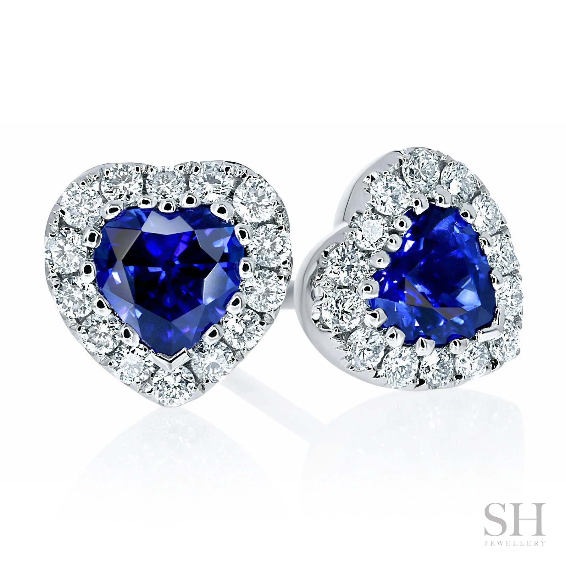 - Charming heart shaped sapphires in fine diamond set haloes
